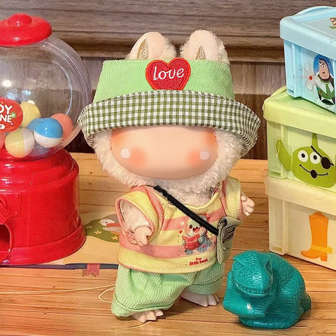 Verano 17 centímetros lindo Labub muñeca de segunda generación juguete de dibujos animados en Material de felpa abrigo de bebé y conjunto de ropa